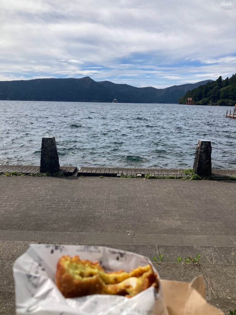 テイクアウトしたパンを食べながらのんびりと芦ノ湖を見るのは心も胃も落ち着く時間でした。