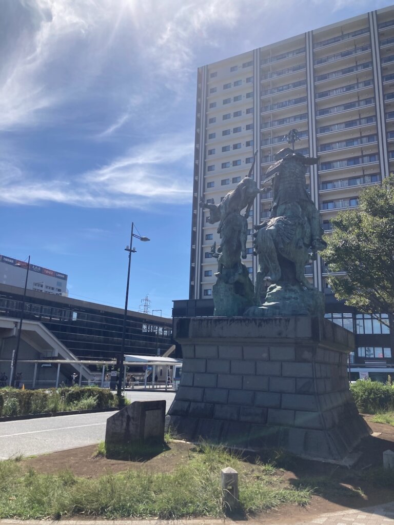 小田原駅のバスロータリーから横断歩道を渡ったところにあるこの銅像の近くでシャトルバスに乗れます(要事前予約)。
