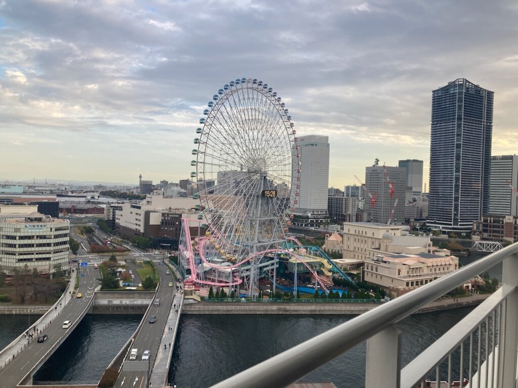 ちょうど夜景が輝き出す時間だったので、バルコニー越しに観覧車を眺めながら乾杯しました🥂。