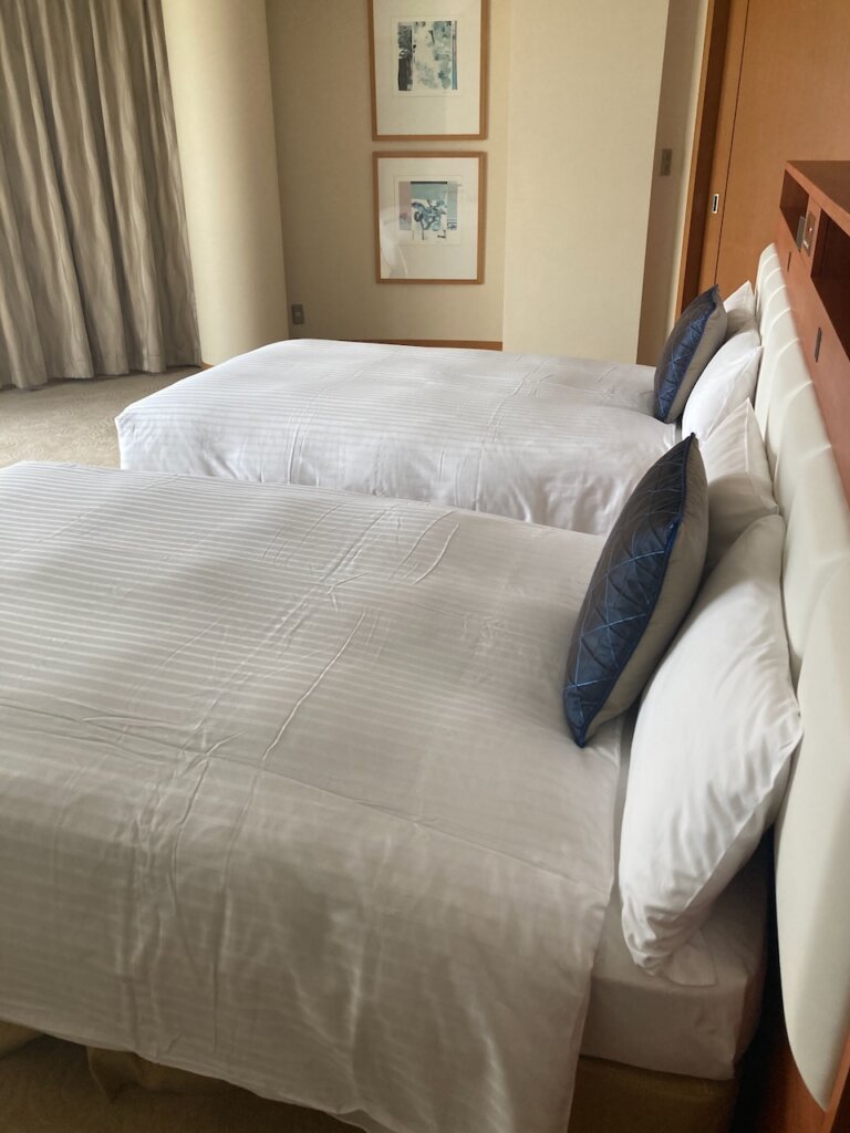 ベッドはシモンズ製のキングサイズで、寝心地抜群!母も「広〜いお部屋で優雅な気分ね」と大満足でした。