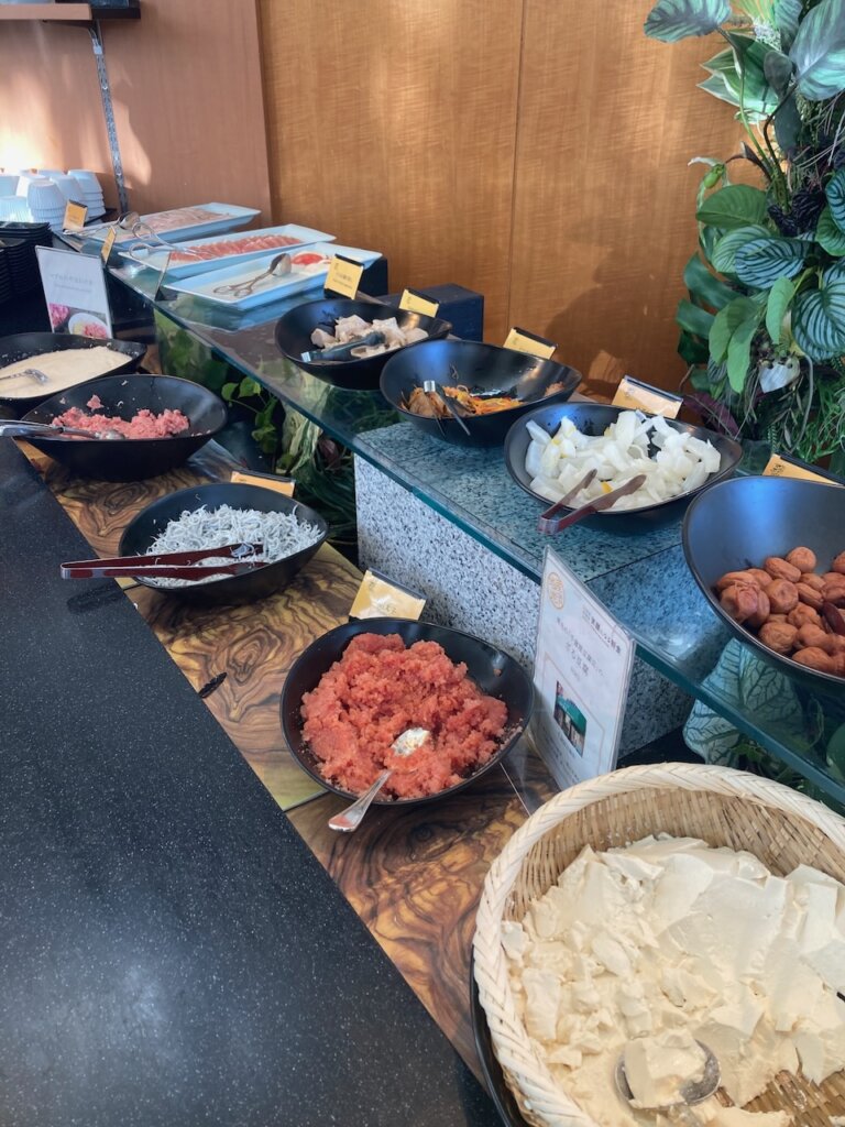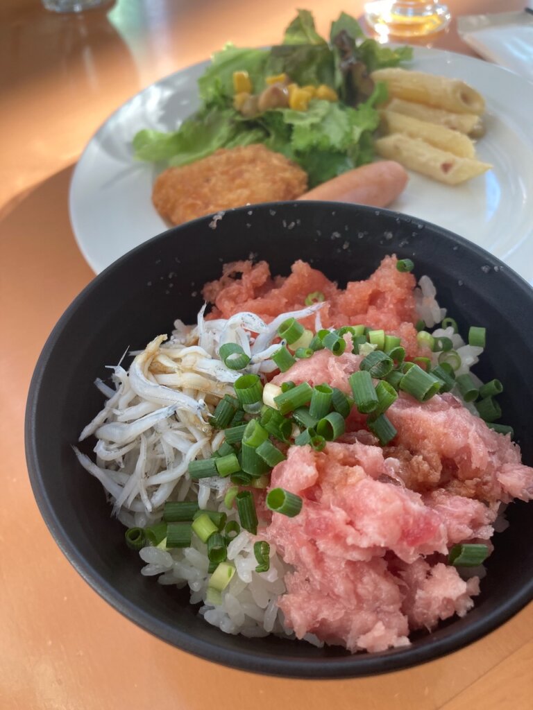 なんと朝からネギトロやマグロのお刺身などがあり、自分でミニ海鮮丼を作れるコーナーがありました🐟✨。